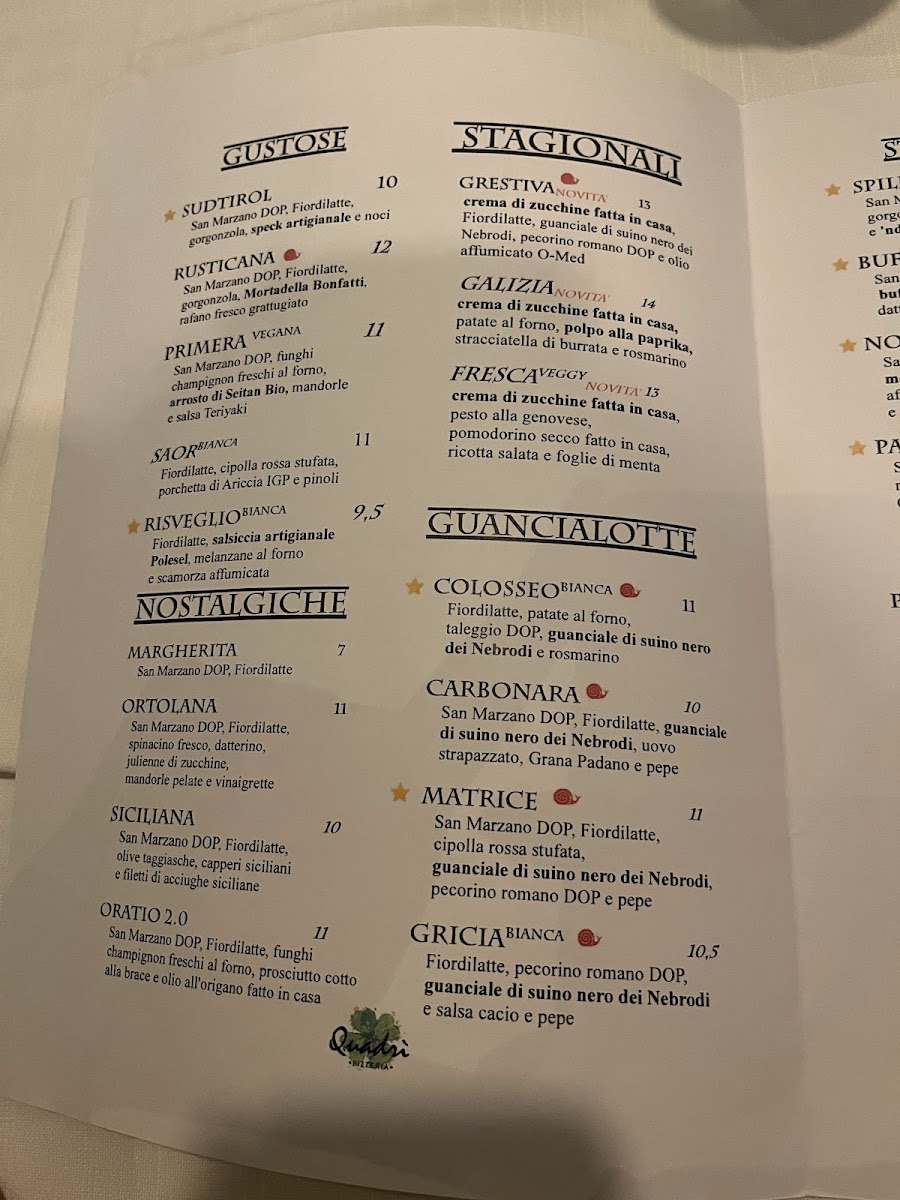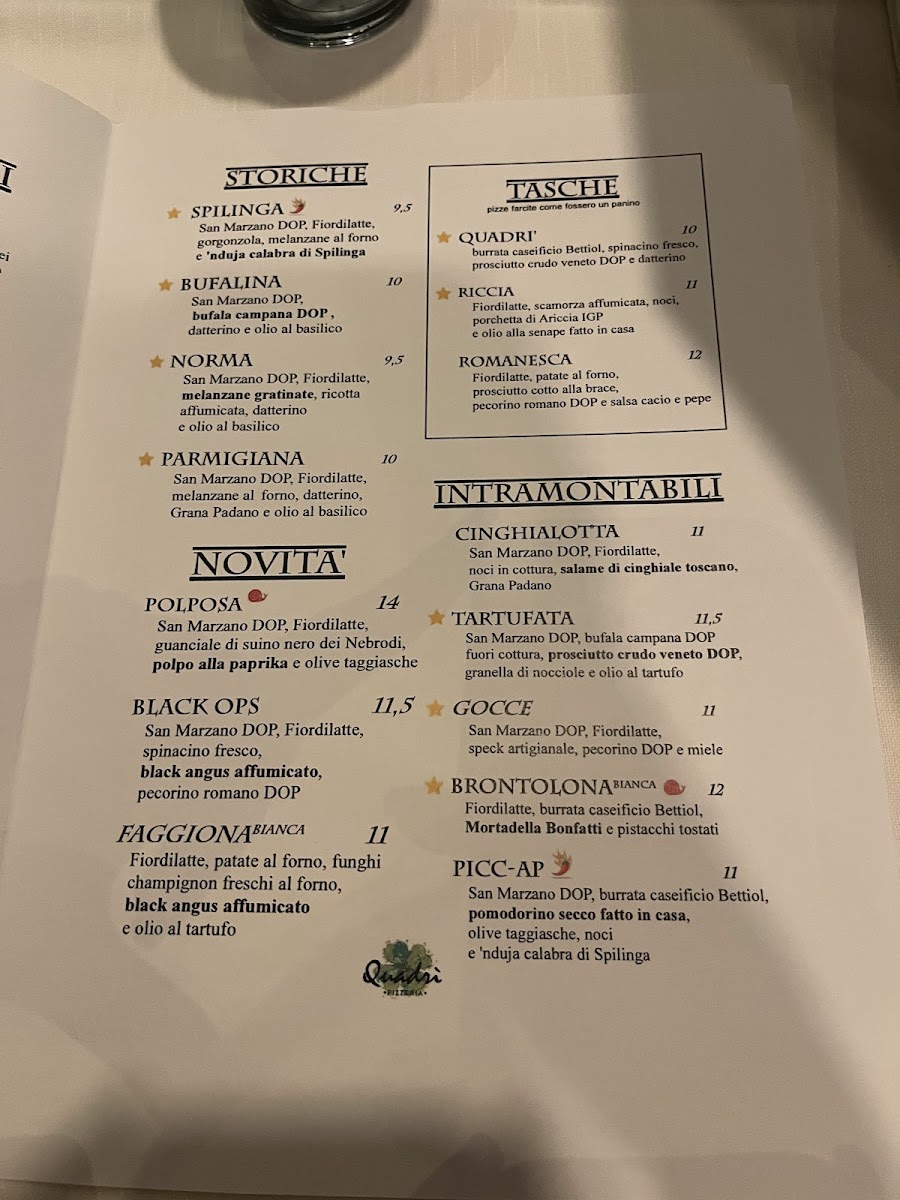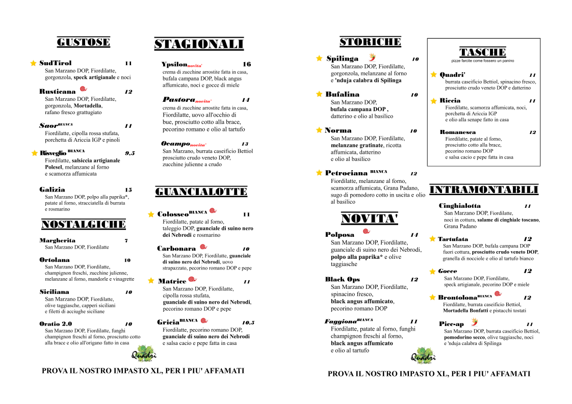 Quadrì Pizzeria, nestled in the heart of San Donà di Piave, offers a bold journey into gourmet pizza craftsmanship. Their menu shines with diverse doughs blended from select flours, paired with top-tier ingredients like fresh cheeses, premium ham, artisan salami, and unexpected toppings such as grilled octopus, potatoes, and pancetta. Signature creations often appear off-menu, highlighting the chef’s inventive spirit and dedication to quality.